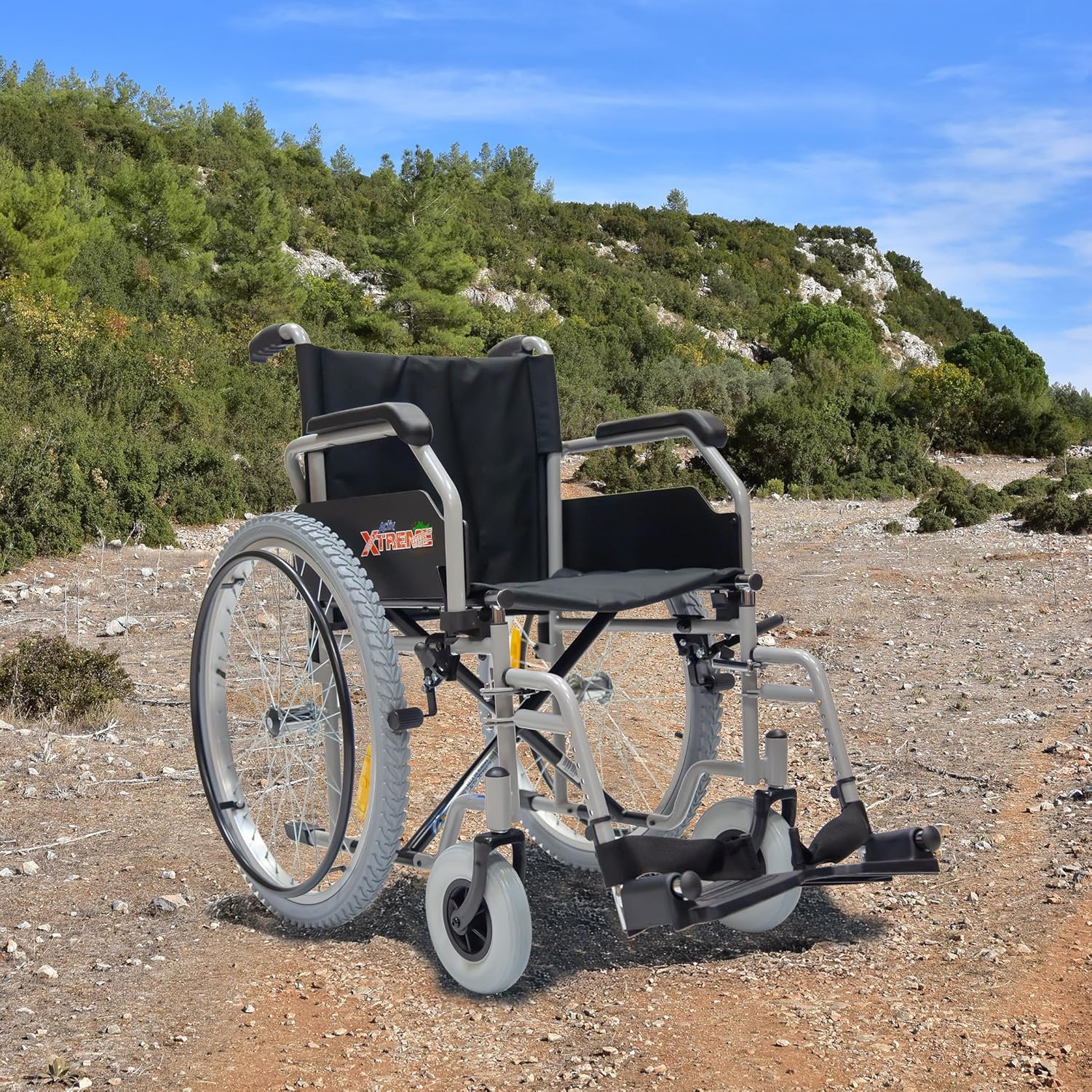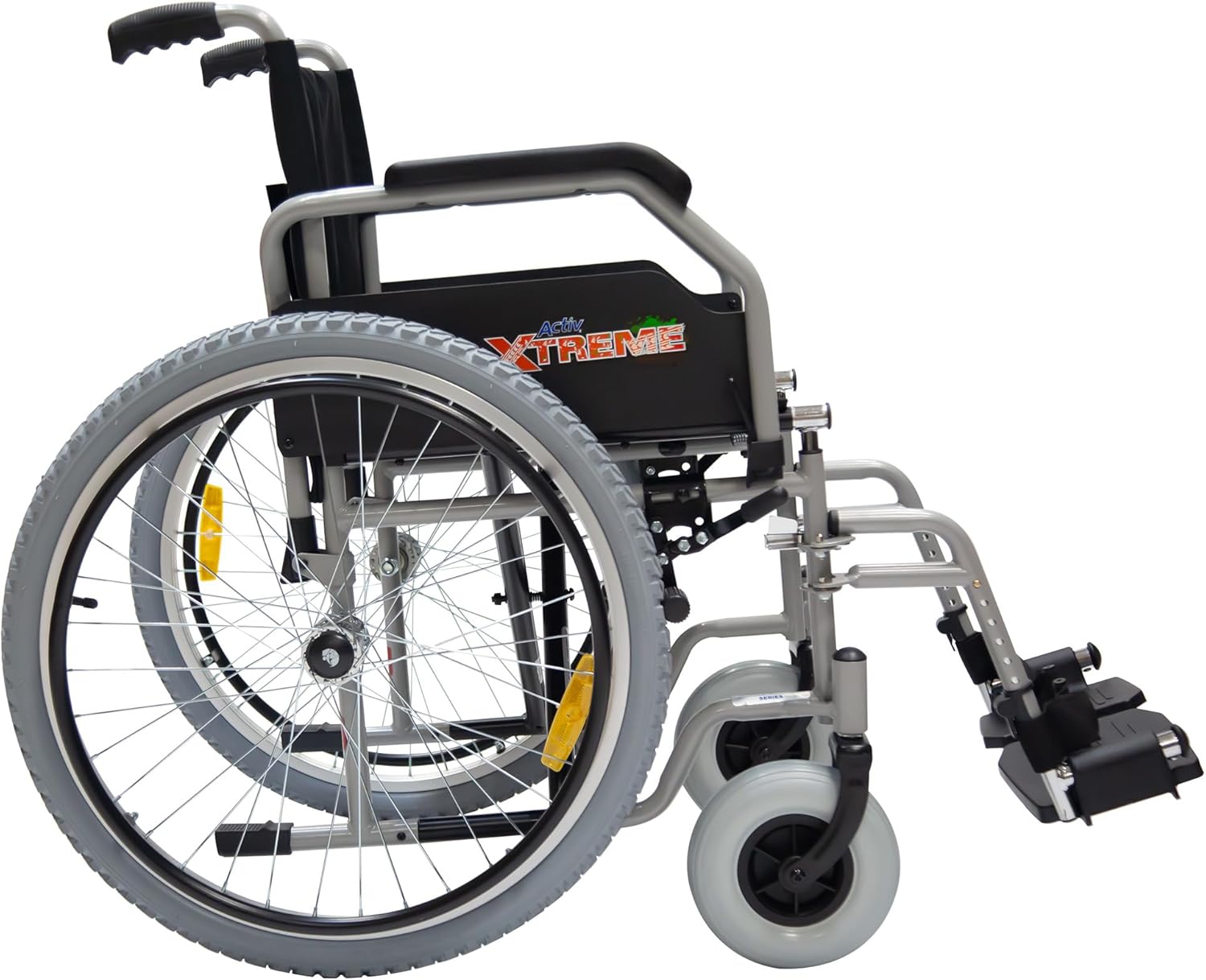 Silla de Ruedas Activ Xtreme ReActiv, Brazos FlipUp y Descansapies Desmontables/Abatibles, R8x2", Rin Aluminio R24x1.75" Neum, T. Nylon, Lodo (Negro)