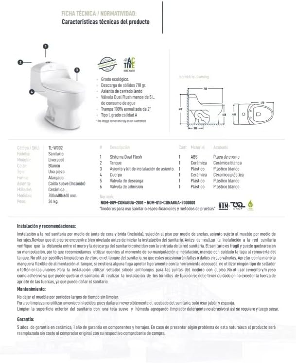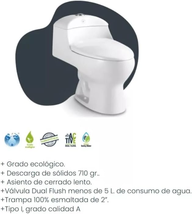 | Componentes incluidos | Asiento y Kit de Instalación de Asiento, Botón de Descarga (Sistema Dual Flush), Tanque y Cuerpo (1 pieza), Válvula de Descarga y Admisión |